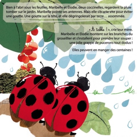 Maribelle et Elodie sont deux belles demoiselles vêtues de robes rouges à pois noirs. Eh oui, ce sont des coccinelles ! Suis-les dans leurs aventures et découvre la vie de ces adorables insectes. Mais attention, ces alliées de nos jardins pourraient bien disparaître si nous ne sommes pas vigilants... La base des illustrations de Séverine Dalla est constituée de collages de papiers de récupération, ce qui augmente encore le côté écologique de cet album.