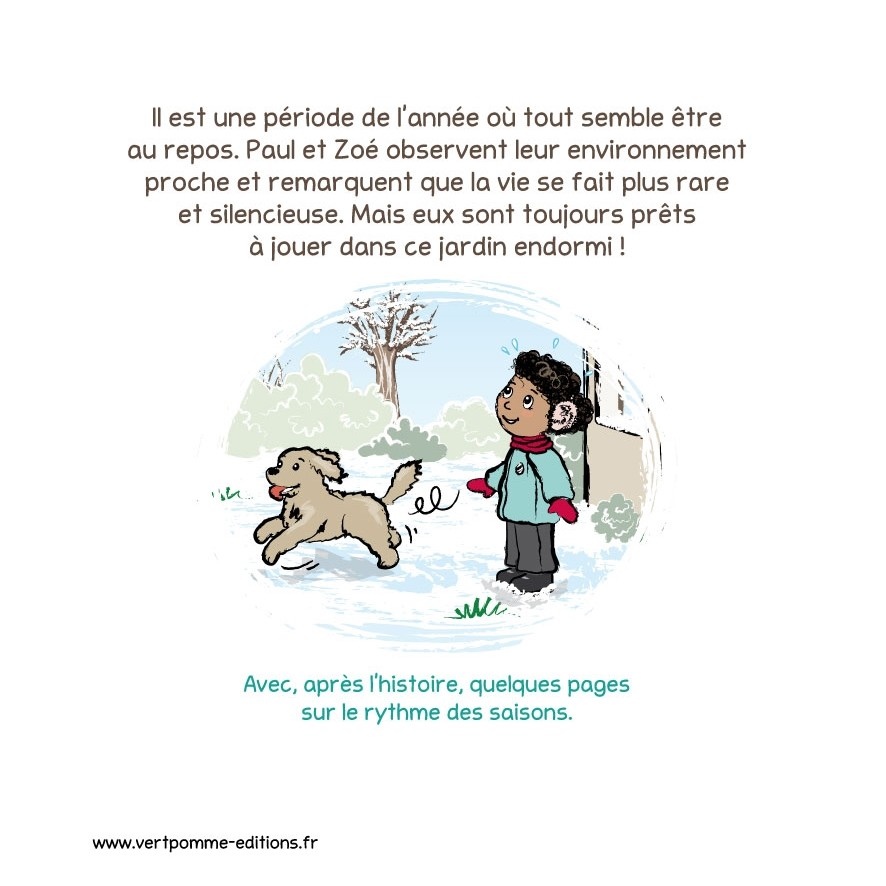 Livre 2 : Il est une période de l'année où tout semble être au repos. Paul et Zoé observent leur environnement proche et remarquent que la vie se fait plus rare et silencieuse. Mais eux sont toujours prêts à jouer dans ce jardin endormi ! Avec des pages documentaires sur les saisons.